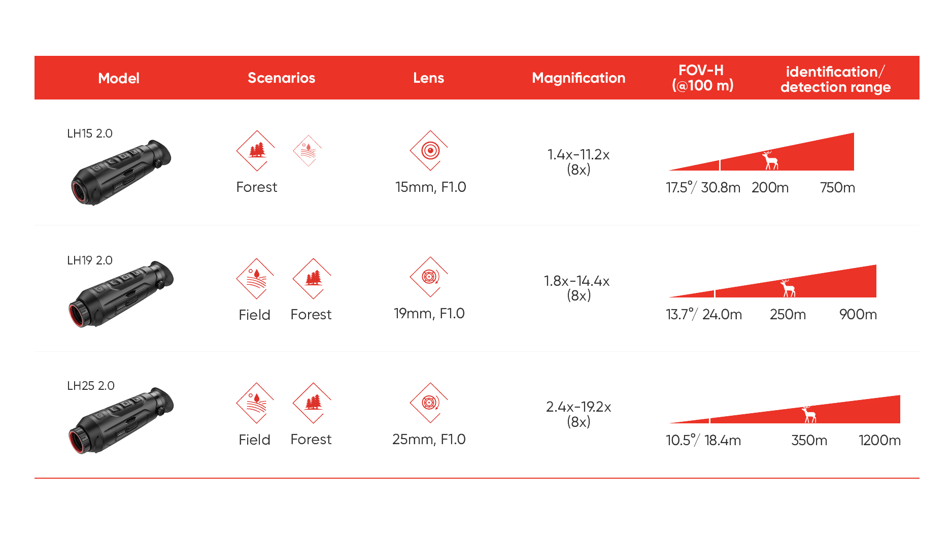 LH25 2.0: 10,5°×7,9°/ 18,4m×13,8m