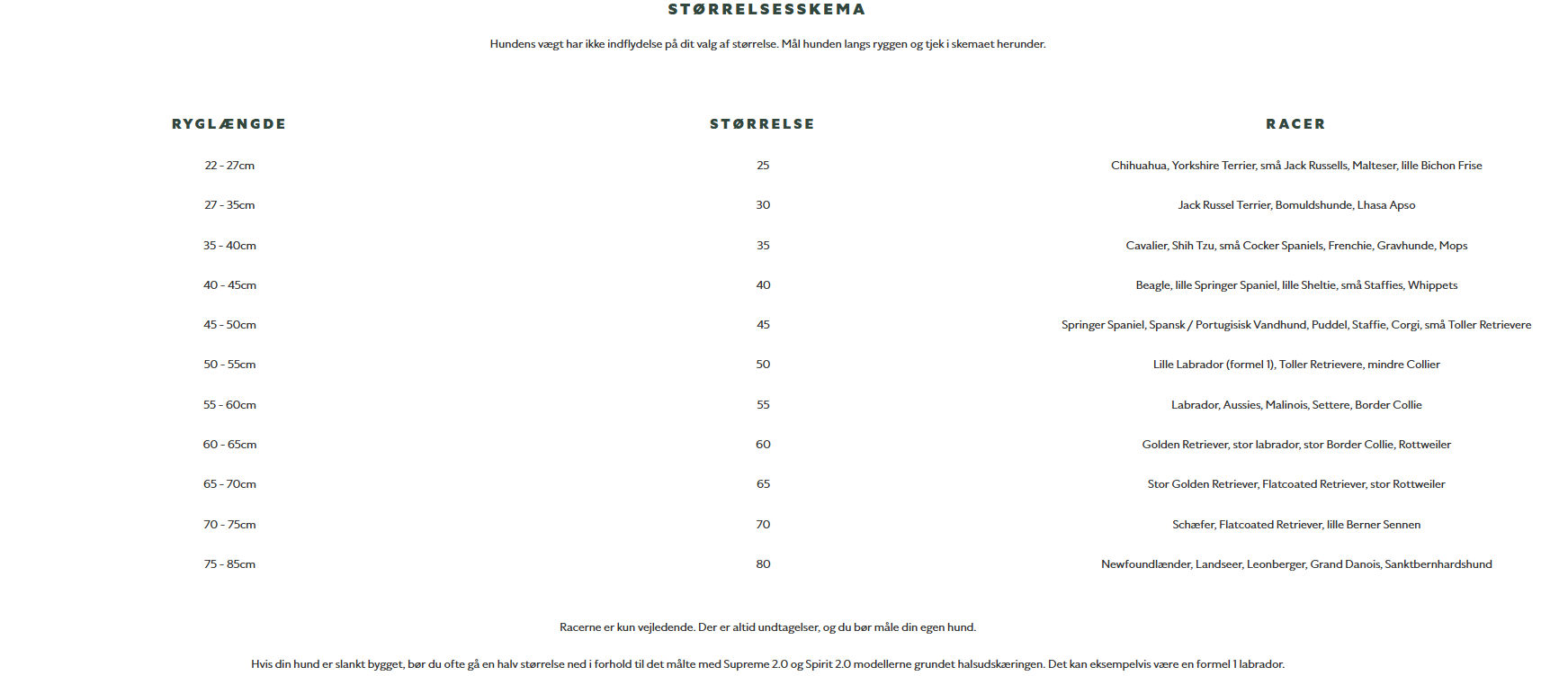 Størrelsesskemaet er inddelt efter ryglængde og varierer mellem forskellige modeller og racer. Det anbefales at måle hunden nøjagtigt, da størrelsen kan variere betydeligt selv inden for samme race. Hvis hunden er mellem to størrelser, eller hvis den har en unik kropsbygning, kan det være en god idé at prøve størrelsen i en fysisk butik.