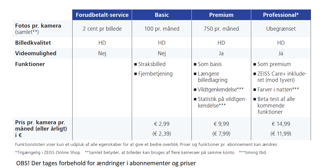Der findes attraktive og retfærdige prisstrukturer tilgængelige for ZEISS Secacams 5 & 7. Du kan vælge mellem en forudbetalt service og forskellige servicepakker, som du kan opsige månedligt uden nogen bindinger. Afhængigt af servicepakken har du adgang til en mere omfattende vifte af tjenester og funktioner.